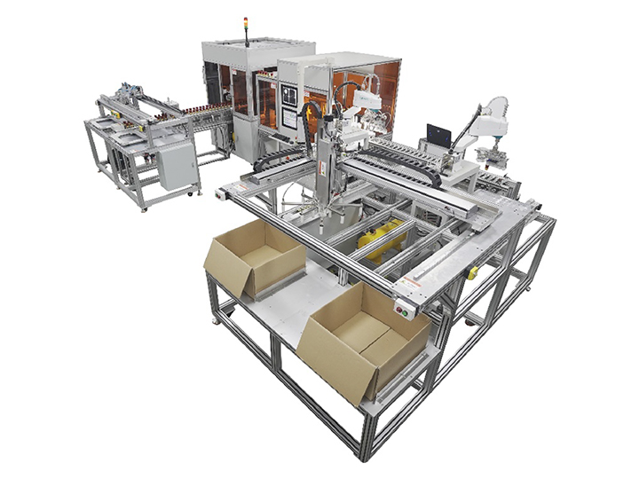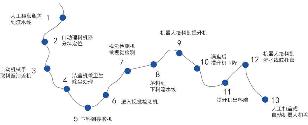 智能化产线:自动托盘上料,卫生洁盖,视觉检测,自动装箱。